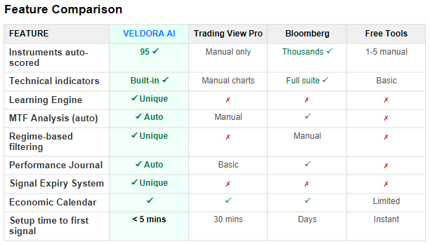 The trading tools market is crowded with expensive institutional platforms and free but limited retail tools. Veldora occupies the gap with professional-grade analysis at retail pricing.